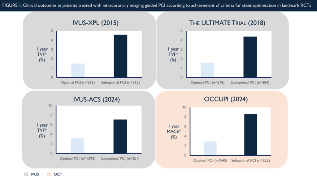 What was consistent across the trials was the apparent importance of achieving the criteria for optimisation. In ULTIMATE, the incidence of the primary endpoint was just 1.6% at 1 year when all three criteria were satisfied, as opposed to 4.4% when this was not the case (or 5.2% when angiographic guidance was used.) In OCCUPI, if optimal OCT guided stent placement occurred, rates of 1-year TVF were just 2.9%, compared to 8.6% with sub-optimal OCT guided stent placement (and 7.4% with angiographic guidance)(15) (Figure 1).