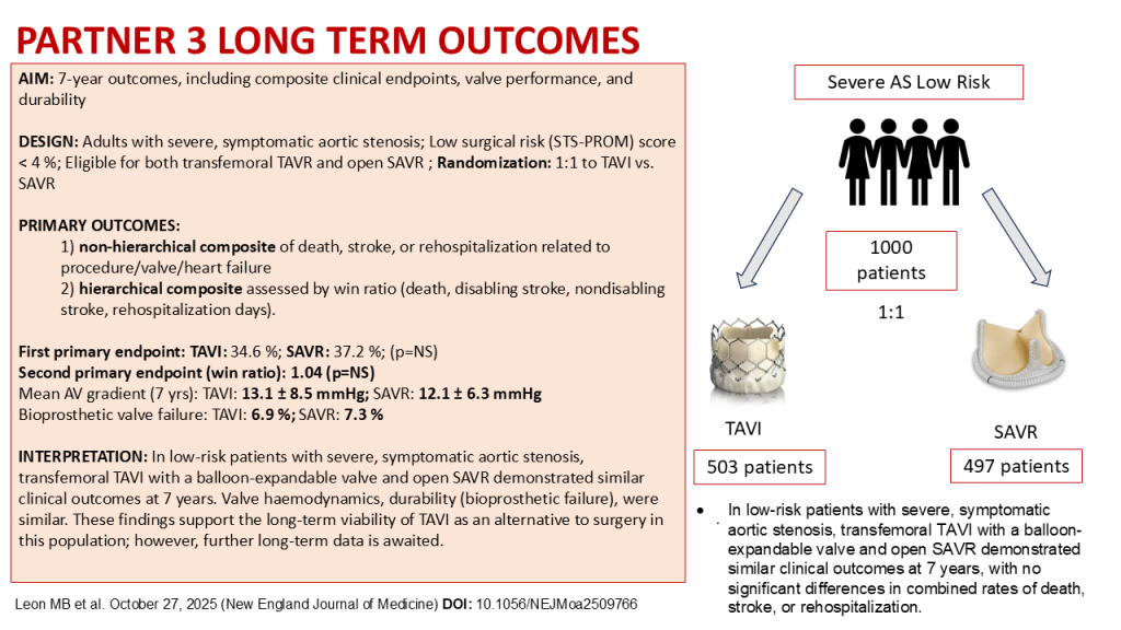 - Leon MB et al. Transcatheter or Surgical Aortic-Valve Replacement in Low-Risk Patients at 7 Years. N Engl J Med. 2025 Oct 27. doi: 10.1056/NEJMoa2509766. Epub ahead of print. PMID: 41144631. October 27, 2025 (New England Journal of Medicine) DOI: 10.1056/NEJMoa2509766