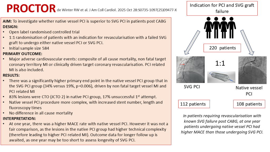 - de Winter RW et al. PROCTOR Trial Investigators. PCI of Native Coronary Artery vs Saphenous Vein Graft After Prior Bypass Surgery: A Multicenter, Randomized Trial. J Am Coll Cardiol. 2025 Oct 28:S0735-1097(25)09477-X. doi: 10.1016/j.jacc.2025.09.1577. Epub ahead of print. PMID: 41159978