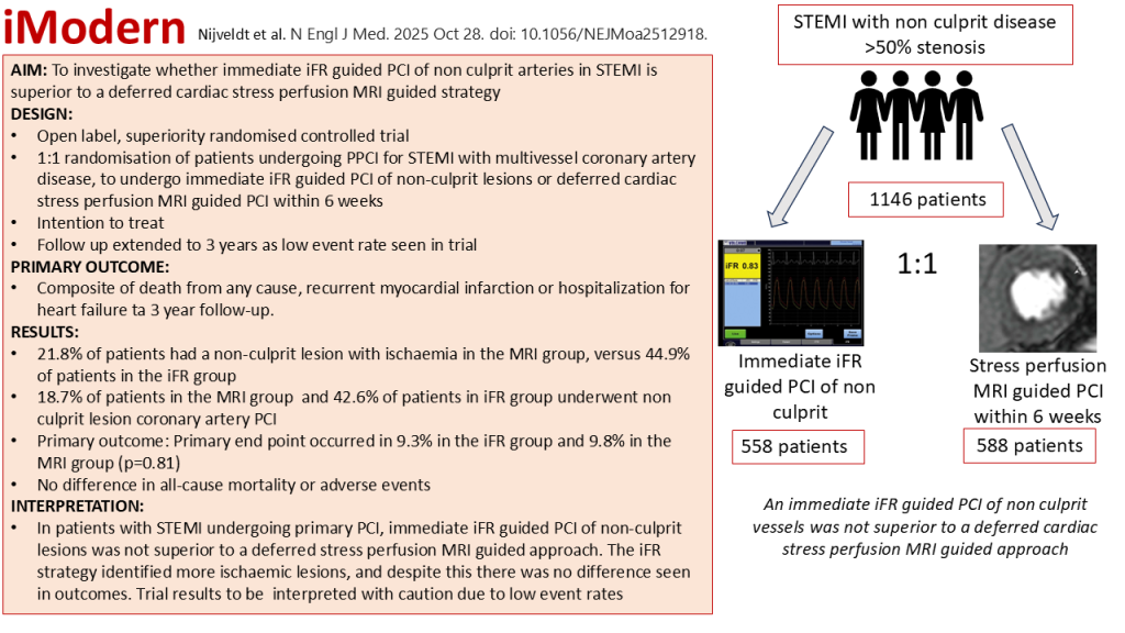 - In patients presenting with STEMI and multivessel coronary artery disease, immediate iFR guided PCI was not superior to a deferred cardiac stress perfusion MRI guided PCI strategy for non culprit lesions.